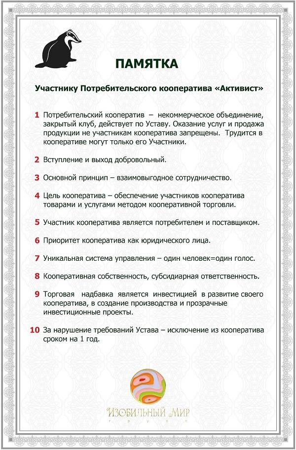 Текст Устава по адресу: https://izobilniy.world/Устав-Потребительского-общества-Активист